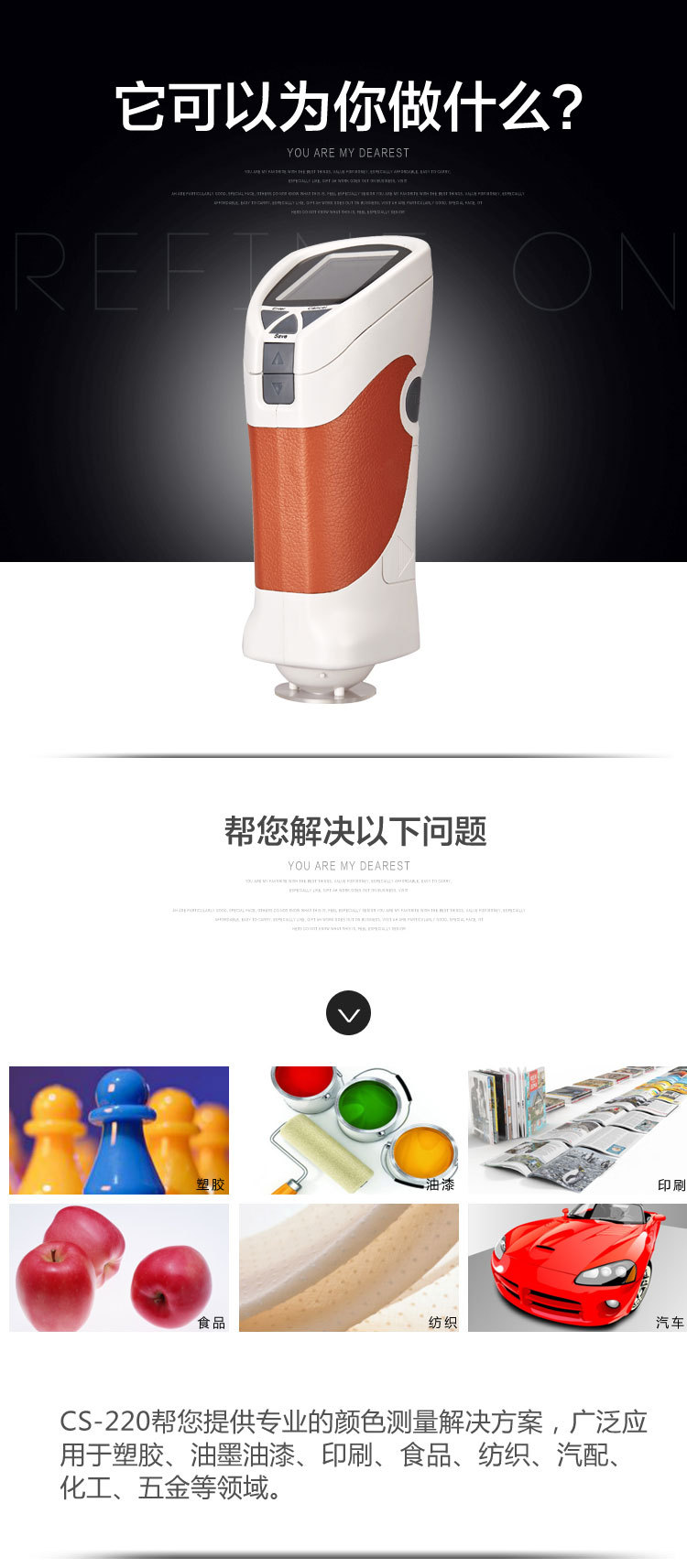 CS-220精密色差儀,廣泛應用于塑膠、印刷、油漆油墨、紡織、印染服裝等行業的顏色管理*域,根據CIE色空間測量樣品色值L*a*b、L*c*h,與被測樣品的色差△E以及 △Lab值。