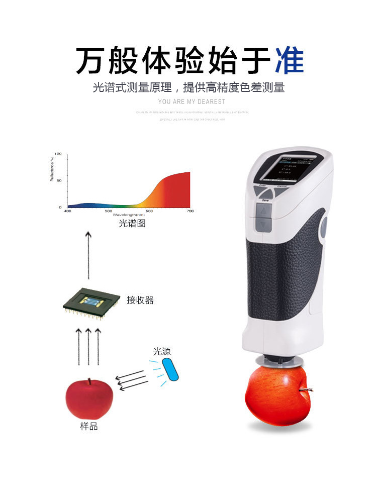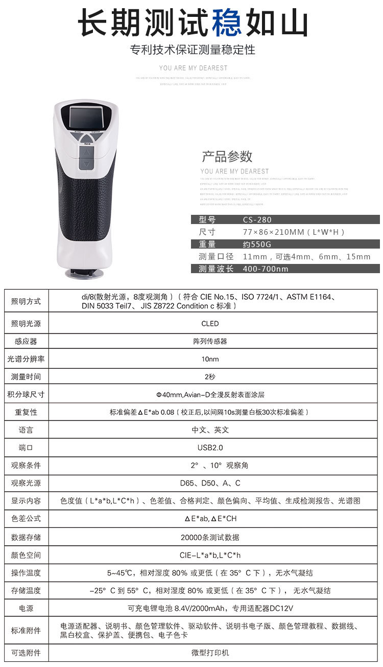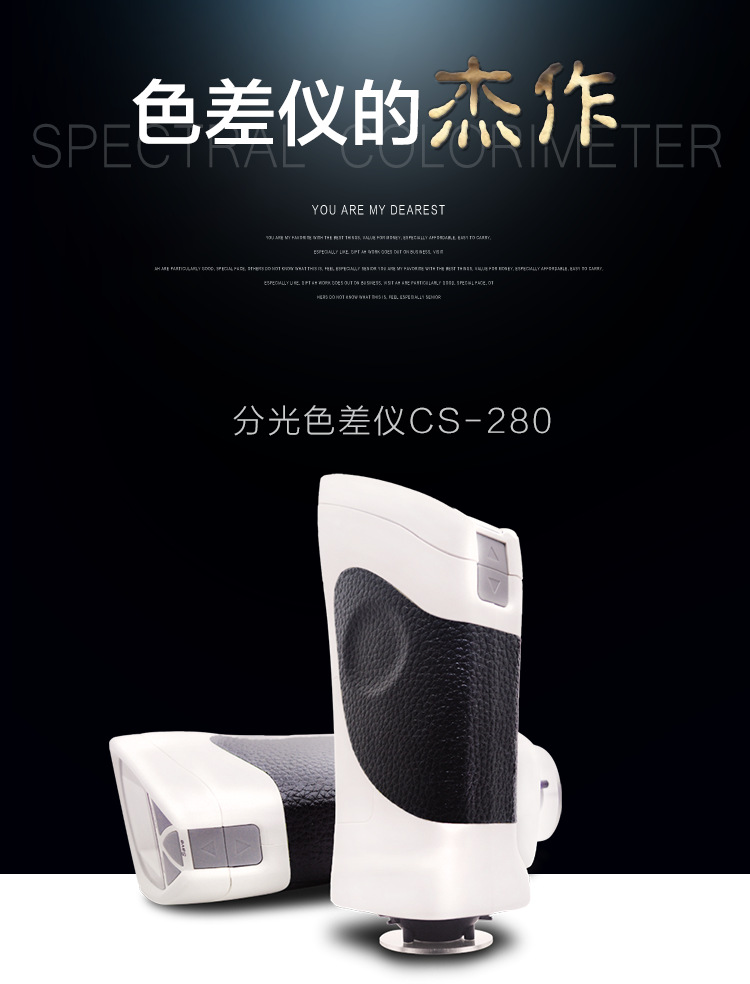 分光式色差儀CS-280采用分光式原理測量顏色色差,廣泛應用于塑膠、印刷、油漆油墨、紡織、印染服裝等行業的顏色管理*域,根據CIE色空間測量樣品色值L*a*b、L*c*h,與被測樣品的色差△E以及 △Lab值。