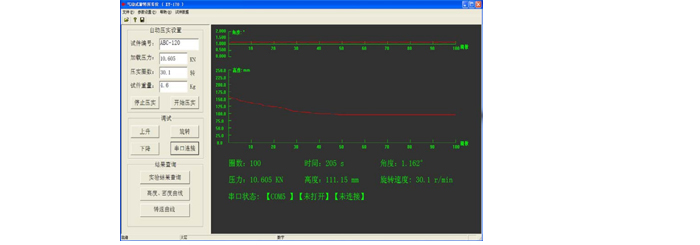 4、可輕松設定旋轉(zhuǎn)壓實角度、壓實壓力、旋轉(zhuǎn)速度、旋轉(zhuǎn)次數(shù)等測試參數(shù),并對壓實實驗結(jié)果進行保存、繪圖、打印等操作。
