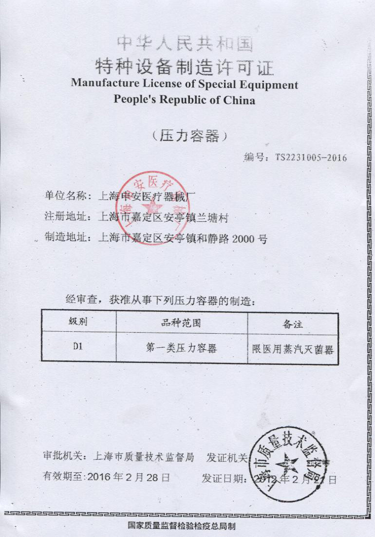 本品符合國家對壓力容器設(shè)計與制作的相關(guān)規(guī)定,并取得了食藥監(jiān)產(chǎn)品注冊證和消毒產(chǎn)品衛(wèi)生許可證,是我廠研制開發(fā)的新一代手提式滅菌器,其結(jié)構(gòu)先進可靠,具有快捷簡便的操作方式和功能齊全的控制系統(tǒng),在安全控制上;設(shè)置了鍋內(nèi)有壓力自動鎖蓋及誤操作合蓋不升壓的裝置。本產(chǎn)品采用優(yōu)質(zhì)不銹鋼材料精制而成,滅菌指標(biāo)達(dá)到國家醫(yī)用手術(shù)級標(biāo)準(zhǔn),是各醫(yī)療衛(wèi)生、大專院校、食品化工、生物科研等單位對器械、敷料、藥液、食品器皿、培養(yǎng)基等物品進行消毒滅菌的理想產(chǎn)品。